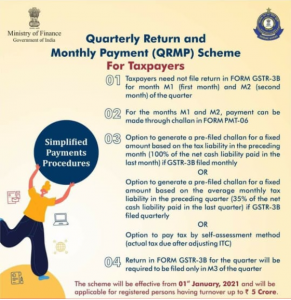 The QRMP (Quarterly Return & Monthly Payment) scheme will be effective from 1st January, 2021 and will be applicable for registered persons having turnover up to ₹ 5 crores. CBIC has clarified that the taxpayers availing the QRMP scheme are not required to file GSTR-3B in the 1st (M1) & 2nd (M2) month of the quarter. It will be required to be filed only in 3rd (M3) month of the quarter for the entire quarter.