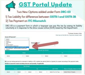The Goods & Services Tax Network (GSTN) has provided 2 new payment options under Form DRC-3. One on account of Liability Mismatch – GSTR-1 to GSTR-3B and other on account of ITC mismatch – GSTR-2A/2B to GSTR-3B. The taxpayer can check the same by navigating the below mentioned path :