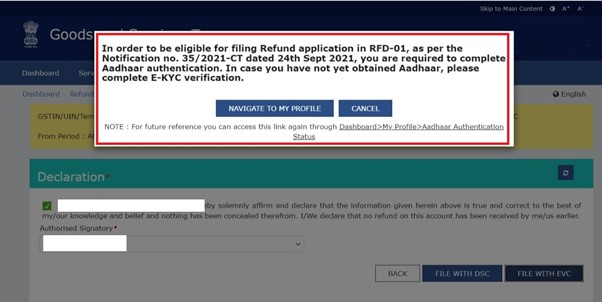The Goods and Services Tax Network (“GSTN”) has blocked the submission of refund applications unless Aadhaar authentication has been done.