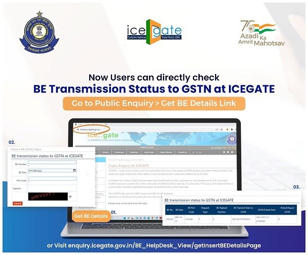 GST Services CBIC Enabled New Feature For Users To Check BOE Transmission Status To GSTN At ICEGATE - April 21, 2022 - admin The Central Board of Indirect Taxes & Customs (CBIC) has enabled a new feature, now users can check the status of their Bills of Entry with GSTN on ICEGATE.